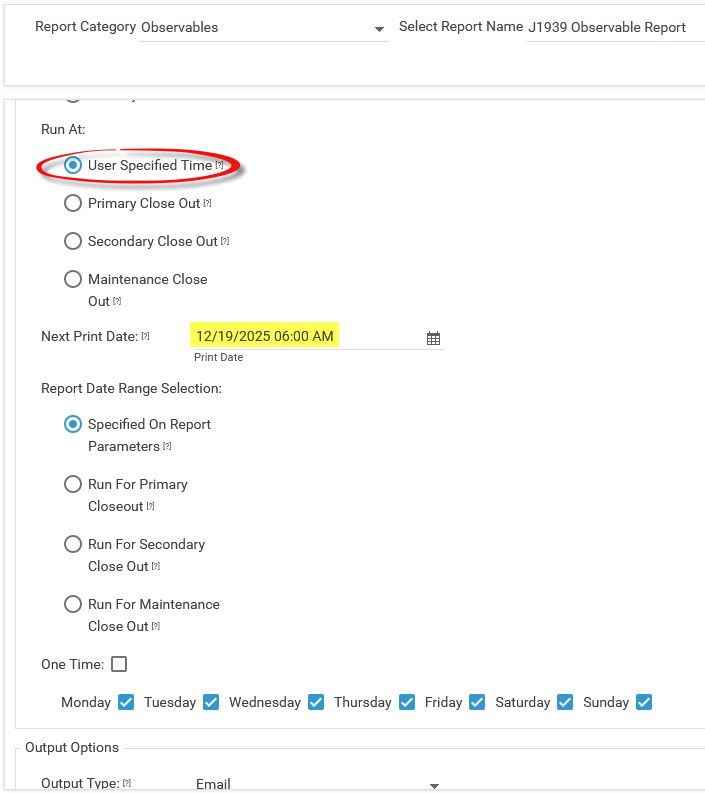 Choose a User Specified Time and adjust the Next Print (Email) Date if necessary.