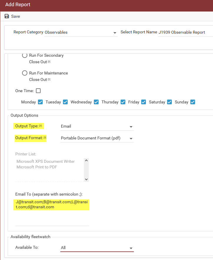 Choose the output type such as Email, the format such as PDF or CSV (Excel).