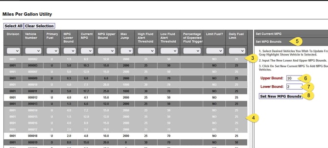 To change the Upper Bound MPG, Lower Bound MPG, and Current MPG settings for multiple vehicles, go to Vehicle Utilities, then the Miles Per Gallon Utility.